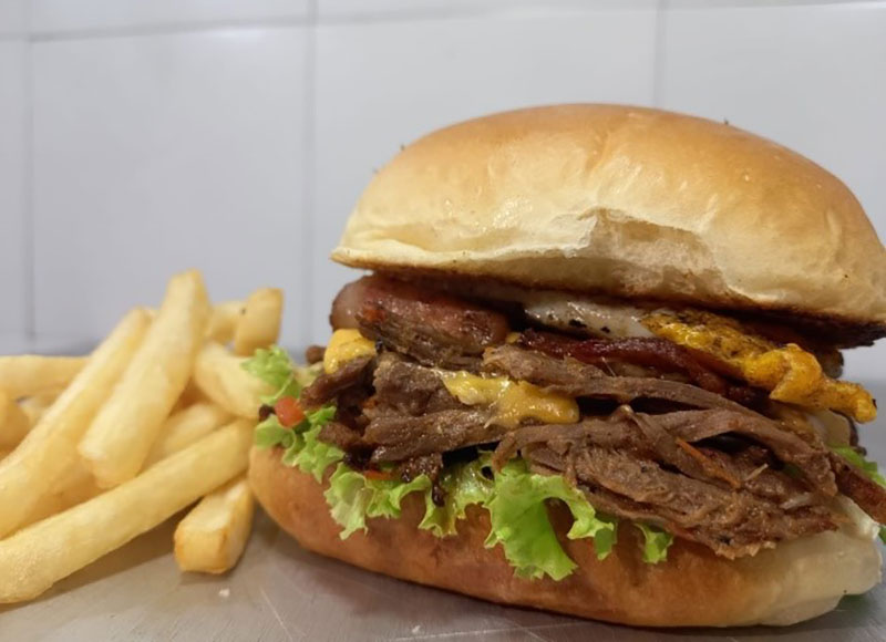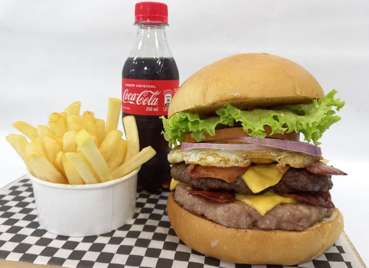 Buen pan brioche, 180 % gramos de carne de res, + 180 gramos de carne de cerdo, doble tocineta, queso importado americano, lechuga, tomatess, cebolla cruda o grille, salsa jackass, bbq, y lo mejor , trae su huevito metido!!!+ papitas