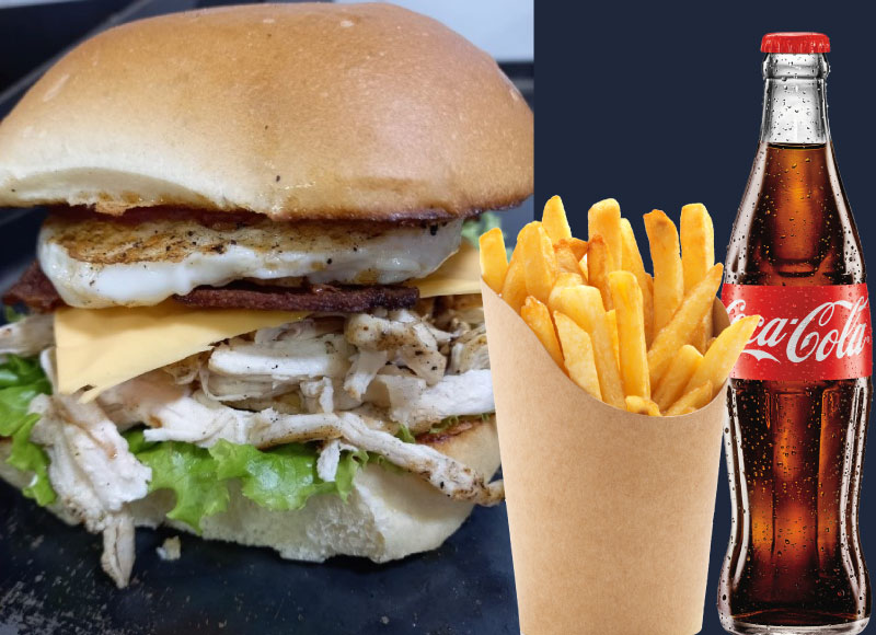 EL mismo pan brioche, 100 gramos  de pollo desmechado, queso americano, tocineta, lechuga, tomatess, salsaas jackass, y lo mejor,,su huevito adentro también!!
